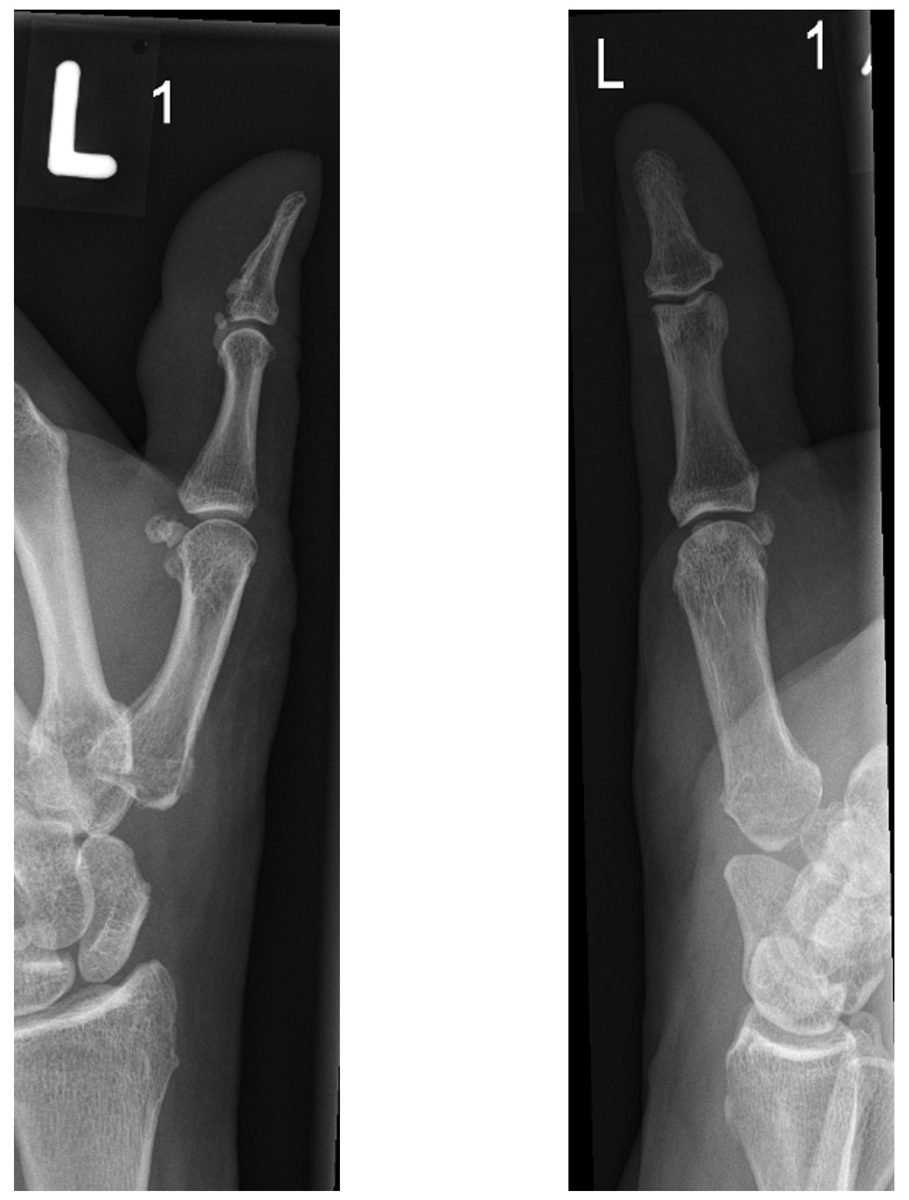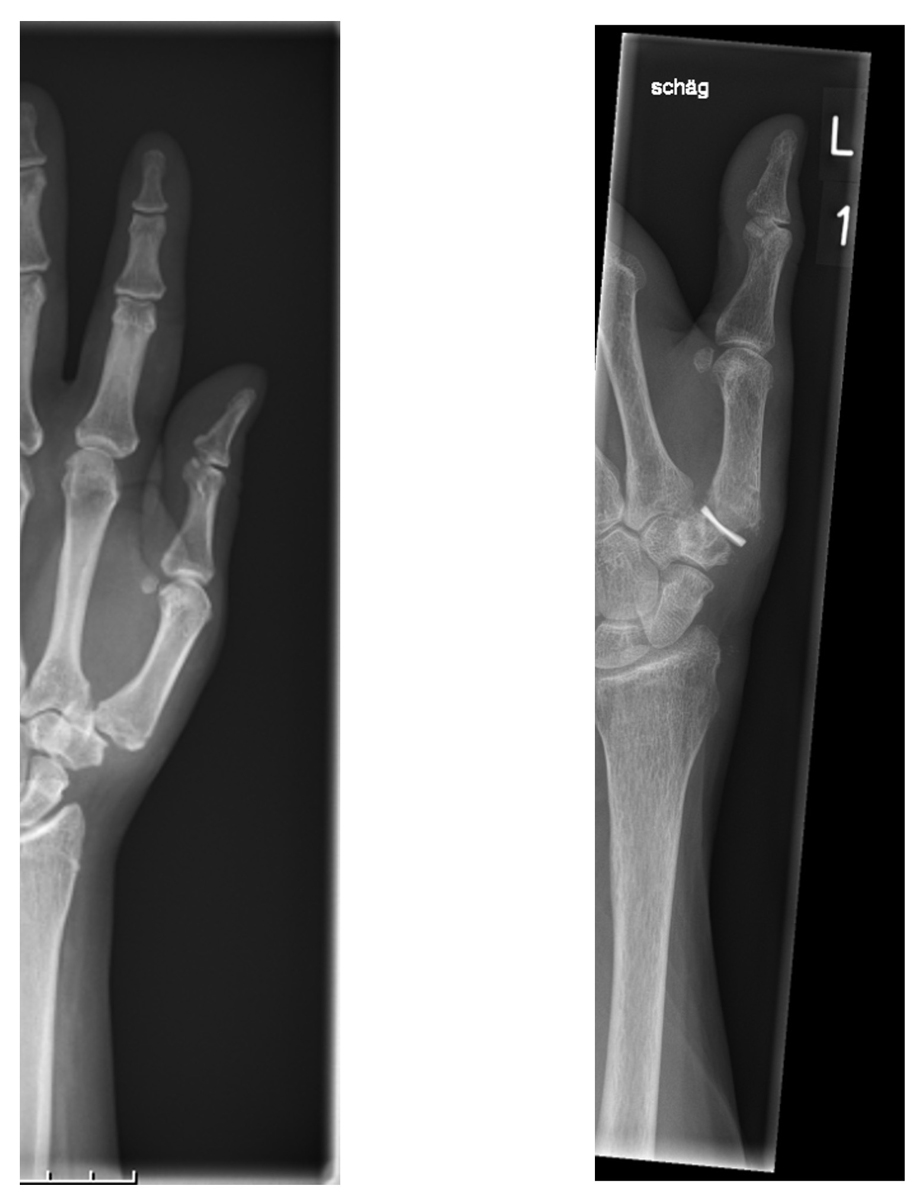 Figure 4 Left thumb after trapeziectomy with ligament reconstruction and tendon interposition. Lateral view (left) and anterior-posterior view (right). After complete resection of the trapezial bone, the height of the thumb is preserved by filling the trapezial space with the partially resected flexor carpi radialis tendon. This resection-tendon-interposition and suspension arthroplasty is used by many hand surgeons.