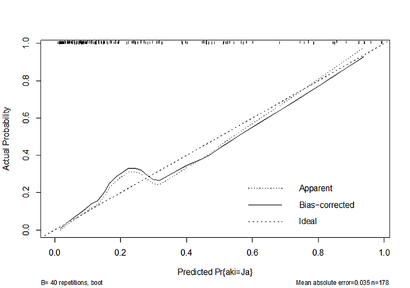 Figure S2 Calibration plot for the prediction of acute kidney injury. The calibration function of the rms package was used for this plot. Bootstrapping using 40 repetitions were used to get bias corrected estimates of the predicted versus the actual probability. An underprediction was observed at lower predicted probabilities.