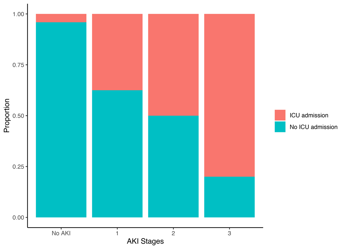 Figure 1 Proportion of patients admitted to the intensive care unit (ICU) stratified by stage of acute kidney injury (AKI).