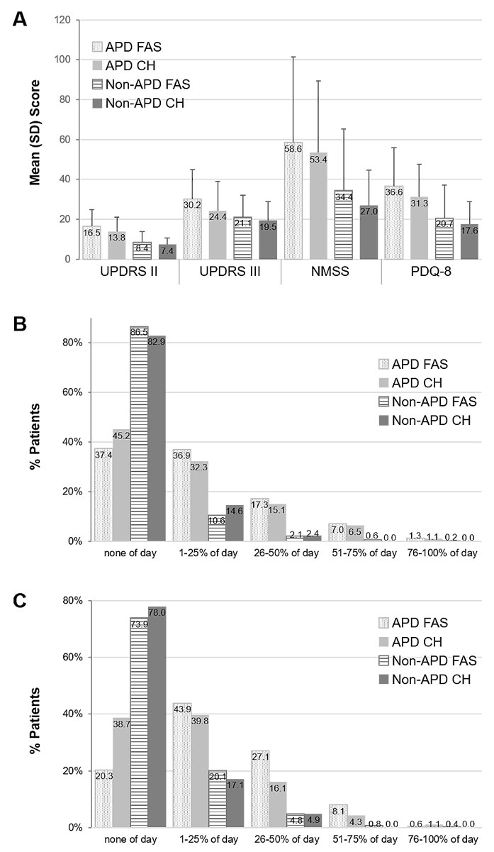 Figure 2 Comparison of the international (FAS) data with the Swiss subgroup. A) Activities of daily living (UPDRS II), motor symptom severity (UPDRS III), non-motor symptom burden (NMSS) and quality of life (PDQ-8); B) Dyskinesia duration (UPDRS Part IV Q32, categories); C) Average duration of “off” time (UPDRS Part IV Q39, categories). Error bars indicate standard deviation (SD). APD FAS = advanced Parkinson’s disease full analysis set; APD CH = advanced Parkinson’s disease Swiss subgroup; non-APD = non-advanced Parkinson’s disease FAS; non-APD CH = non-advanced Parkinson’s disease Swiss subgroup; NMSS = Non-motor Symptoms Scale; PDQ-8 = 8-Item Parkinson’s Disease Questionnaire; UPDRS = Unified Parkinson’s Disease Rating Scale
