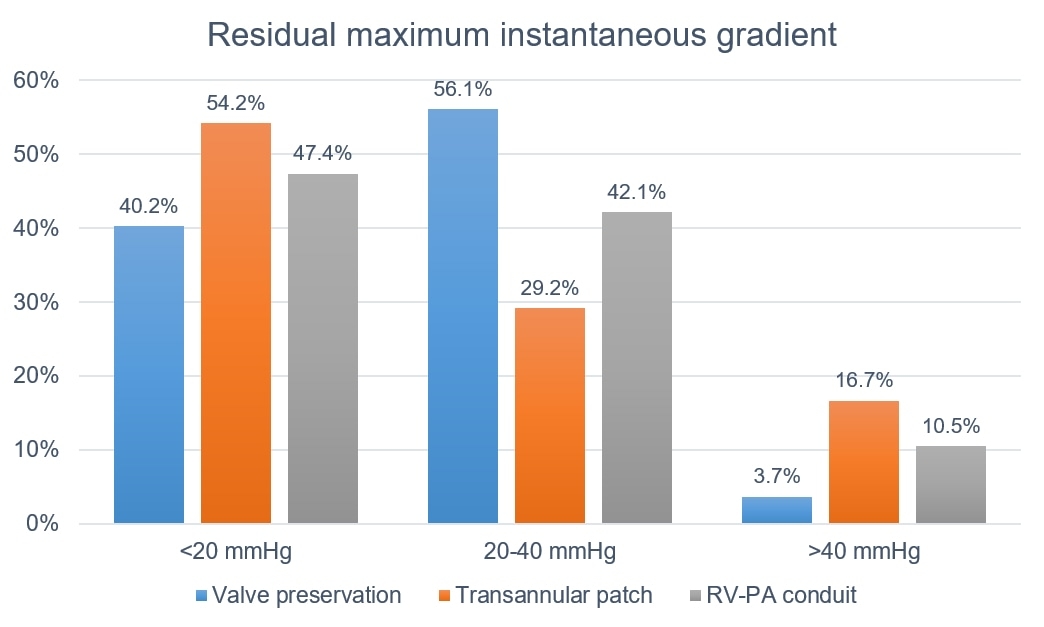 Figure 1 Proportion of patients by degree of residual right ventricular outflow tract (RVOT) stenosis and type of surgical correction. RV-PA = right ventricular-to-pulmonary artery