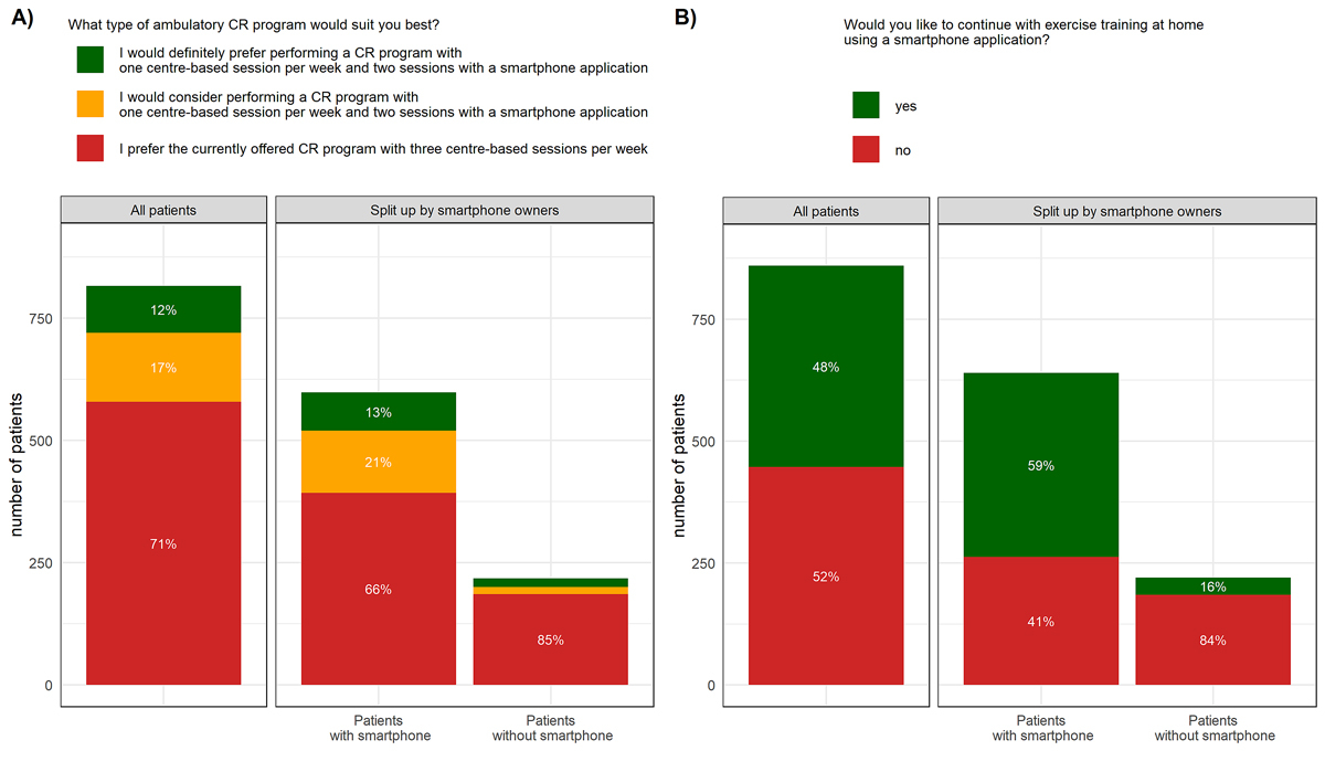 Figure 1 Interest in a smartphone application as part of the traditional cardiac rehabilitation (phase II, panel A) and for the long-term aftercare (phase III, panel B) overall and grouped by smartphone users and non-users.