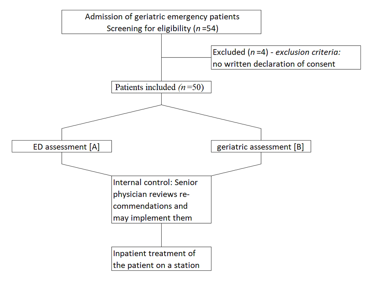 The patients of this prospective clinical pilot study were randomly selected from a population of geriatric patients aged ≥70 years who were admitted to the interdisciplinary ED of a single tertiary care medical centre (University Hospital RWTH Aachen, Germany). Another inclusion criterion was an “Identification of Seniors at Risk” score (ISAR score) of ≥2 [14]. The study enrolment was independent of the admission diagnosis. However, the study population mainly consisted of patients with internal medical diseases. Exclusion criteria were: