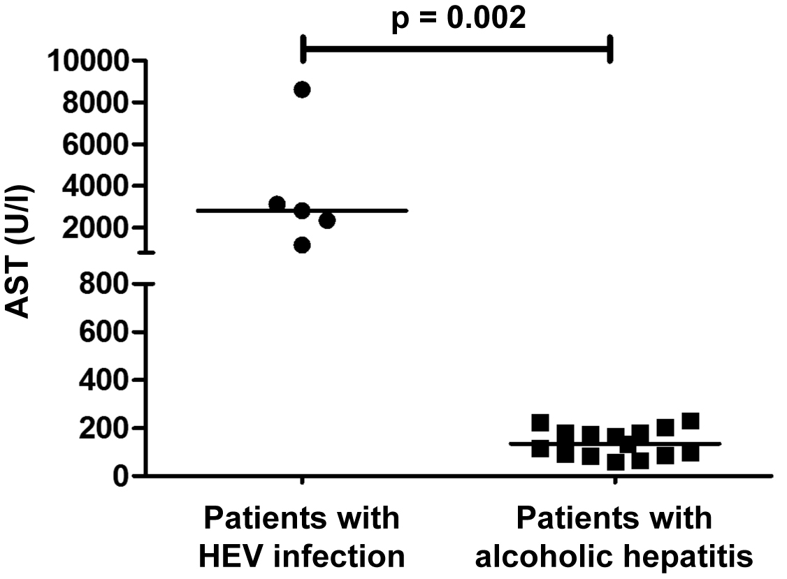 After matching our patients with HEV-related ACLF to patients with severe alcoholic hepatitis and a similarly poor prognosis, we found that AST levels were significantly higher in patients with HEV-related ACLF. This finding underscores the clinical relevance of marked transaminase elevation in HEV-related ACLF.