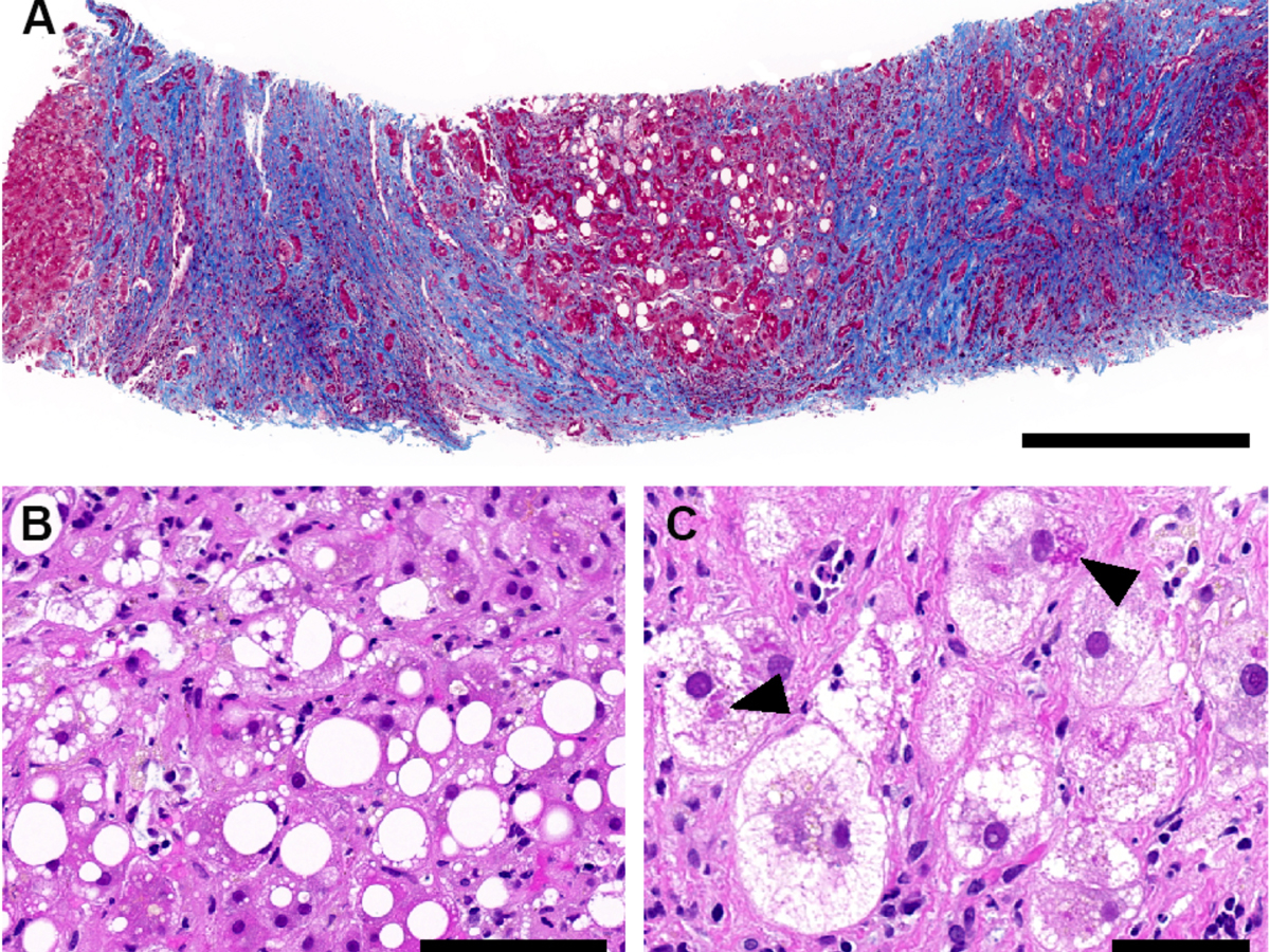 Figure 1 Histopathological findings in liver biopsies, exemplified by patient 3. (A) Cirrhotic liver parenchyma with steatosis (Masson trichrome stain; scale bar: 500 μm). (B) Macro- and microvesicular steatosis with necroinflammation (H and E stain; scale bar: 100 μm). (C) Hepatocytes with ballooning and Mallory-Denk hyaline (black arrowheads) (H and E stain; scale bar: 50 μm).