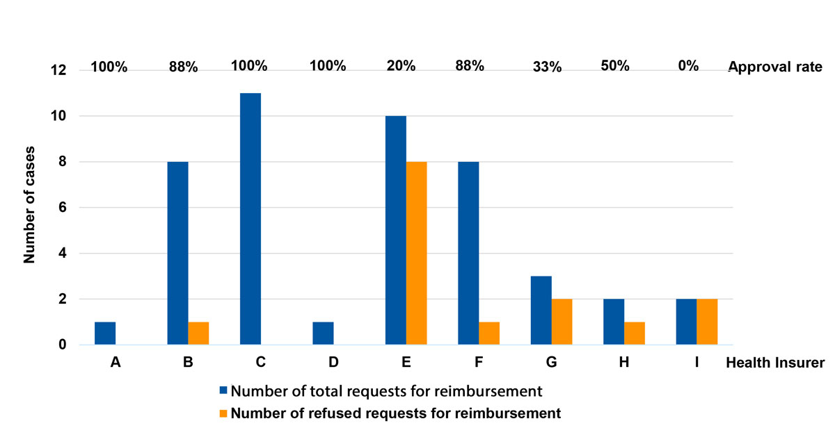 We identified nine different insurance companies. No insurance company provided established policies for decision making on cost coverage, and insurers allegedly decide on a case-by-case basis when provided with certain patient details. However, based on our data health insurers seem to make their decision for reimbursement of costs based upon subjective criteria.
