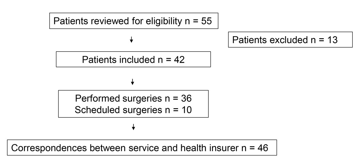 We reviewed 55 patient charts and included 42 patients who were eligible for analysis. They had either already undergone or were scheduled for lymphatic microsurgery. Four patients underwent two subsequent lymphatic reconstructive surgeries. Finally, a total of 46 sets of correspondence between our department and the insurance companies were identified. Thirteen patients were excluded because of incomplete records, lack of or refusal to sign the institutional general consent form, or because they were international patients. Figure 1 shows a flow chart for patient selection.