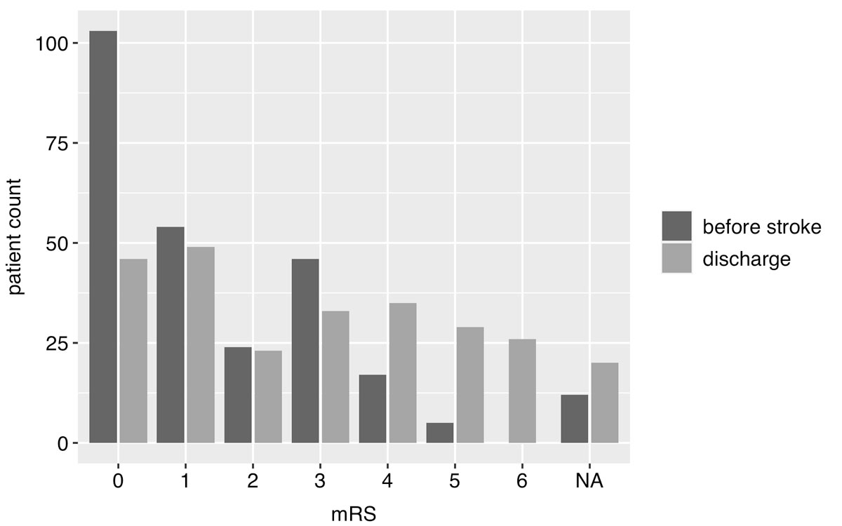 We compared the modified Rankin Scale (mRS) scores [20, 21] before stroke and at hospital discharge. The mRS is a grading system of functional independence in stroke patients ranging from 0 to 6.