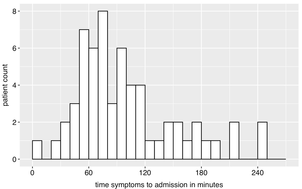 Figure 2 Histogram of time from beginning of symptoms to presentation in the emergency unit in early presenting patients (≤4.5 hours of symptom onset). Exact time was available for 60 of 91 patients.