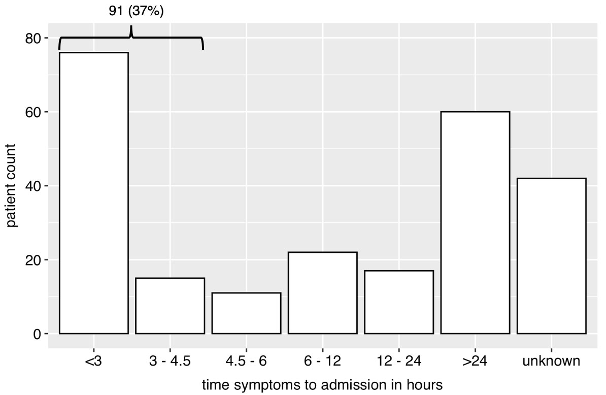 There were 91 (37%) patients who were admitted to the emergency room with out-of-hospital stroke within 4.5 hours of symptom onset. Fifty-five (60%) were ischaemic strokes, 23 (25%) TIAs and 13 (14%) bleedings. Time from onset of symptoms to admission is presented in figure 1 for all patients and in figure 2 for patients who presented early (within 4.5 hours). Of the latter, 45 (49%) were female, compared with 68 (45%) patients who presented after 4.5 hours of symptom onset (late presentation) (p = 0.56). Median age was 76 years (IQR 67–84) and 79 years (70–84) in the early and late presenting groups, respectively (p = 0.35). The mRS score did not differ between early and late presenting patients (p = 0.72). Of early presenting patients, 75 (82%), 15 (16%), 0 (0%) and 1 (1%), respectively, were admitted from home, a retirement/nursing home, other hospital or other institution, compared with 136 (89%), 13 (9%), 1 (1%) and 2(1%), respectively, of late presenting patients (p = 0.18). Median time until admission in the early presentation group was 86 minutes (60–120). Median NIHSS score in this group was 5 (3–10) at admission, 2 (1–3) after thrombolysis and 1 (0–4) at discharge. Median time from admission to CT was 28 minutes (22–46), including perfusion scanning 48 minutes (40–63). Thrombolytic therapy was started in 27 patients, representing 49% of patients with out-of-hospital ischaemic stroke and presentation within 4.5 hours. Median door-to-needle time was 55 minutes (40–67). Door-to-needle time was within 60 minutes in 16 (59%) of patients.