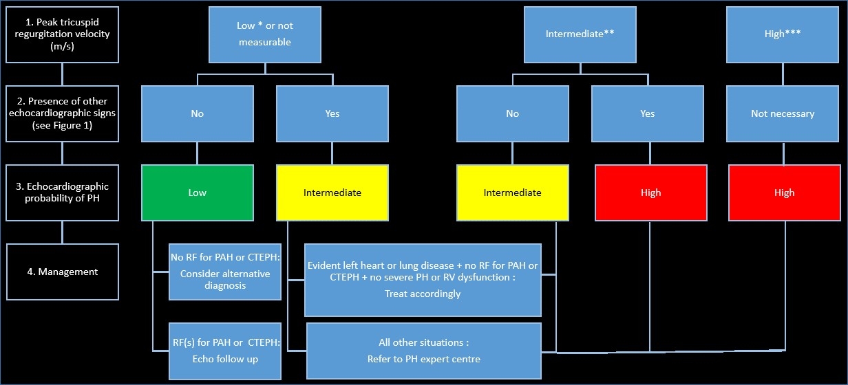 Figure 3 Evaluation of the echocardiographic probability of pulmonary hypertension and further management in a 4 steps approach. For management, consider if the patient has risk factors (RF) or associated conditions for pulmonary artery hypertension (PAH), or chronic thromboembolic pulmonary hypertension (CTEPH). Adapted from Galiè 2016 [1]. Other TTE signs are considered if ≥2 indices from ≥2 classes are present.