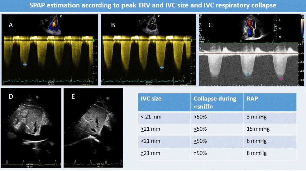 Figure 1 A. Incomplete continuous wave (CW) Doppler spectral wave envelope leading to peak tricuspid regurgitation velocity (TRV) underestimation (3.69 m/s). B. same patient after correct adjustment of CW Doppler in TR jet with correct TRV estimation (4.15 m/s). C. Inadequate CW gain with “fringes” and peak TRV overestimation (pink cross: 5.62 m/s); correct peak TRV estimation in modal frequency (4.69 m/s). D and E. Inferior vena cava (IVC) size during expiration and “sniff” in the same patient. SPAP = systolic pulmonary arterial pressure