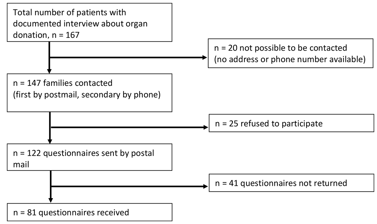 As shown (figure 1), a total of 167 interviews on organ donation were analysed. Twenty next of kin could not be contacted for technical reasons (invalid address / telephone number, or death). A total of 147 families were contacted. Twenty-five next of kin refused to participate and 122 questionnaires were sent. Eighty-one questionnaires were returned and analysed, corresponding to a retrieval rate of 66% (fig. 1). Detailed data are given (table 1). Sixty-three percent (22/35) of the next of kin consenting to organ donation returned the questionnaire, and 68% (59/87) of next of kin refusing organ donation did so. Responses were analysed according to availability (see appendix in the PDF version of the manuscript). Most participants were female (n = 44, 54%). The following relationships to the deceased person applied: husband/spouse n = 34 (42%), parent n = 23 (28%), sibling n = 12 (15%), daughter/son n = 11 (14%), not specified n = 1 (1%). The personal attitude towards organ donation was declared as: consenting 55 (68%), dismissive in 10 (12%) and undecided in 14 (17%); 2 gave no response (2%). Out of all questionnaires, 49 (60%) covered next of kin who consented to organ donation and 32 (40%) were from next of kin who refused organ donation. The presumed will of the deceased patient was known in 50 cases (62%), comprising 15 written documents (donor card, patient directive) and 41 volitions; multiple answers were possible to this question. In 72% of cases (n = 58), the final next of kin decision on organ donation corresponded to the presumed will, whereas in one single case the decision taken by the next of kin did not match the presumed patient will. In that case, the next of kin declared that the patient was not aware that waiting for brain death would prolong treatment on the ICU. In Lausanne, fewer next of kin rejecting organ donation participated in the survey (only French-speaking) compared with Bern (German- and French-speaking): Lausanne 18 consenting, 5 refusing; Bern 31 consenting, 27 refusing. All results of the questionnaire are provided in the appendix in the PDF version of the manuscript.