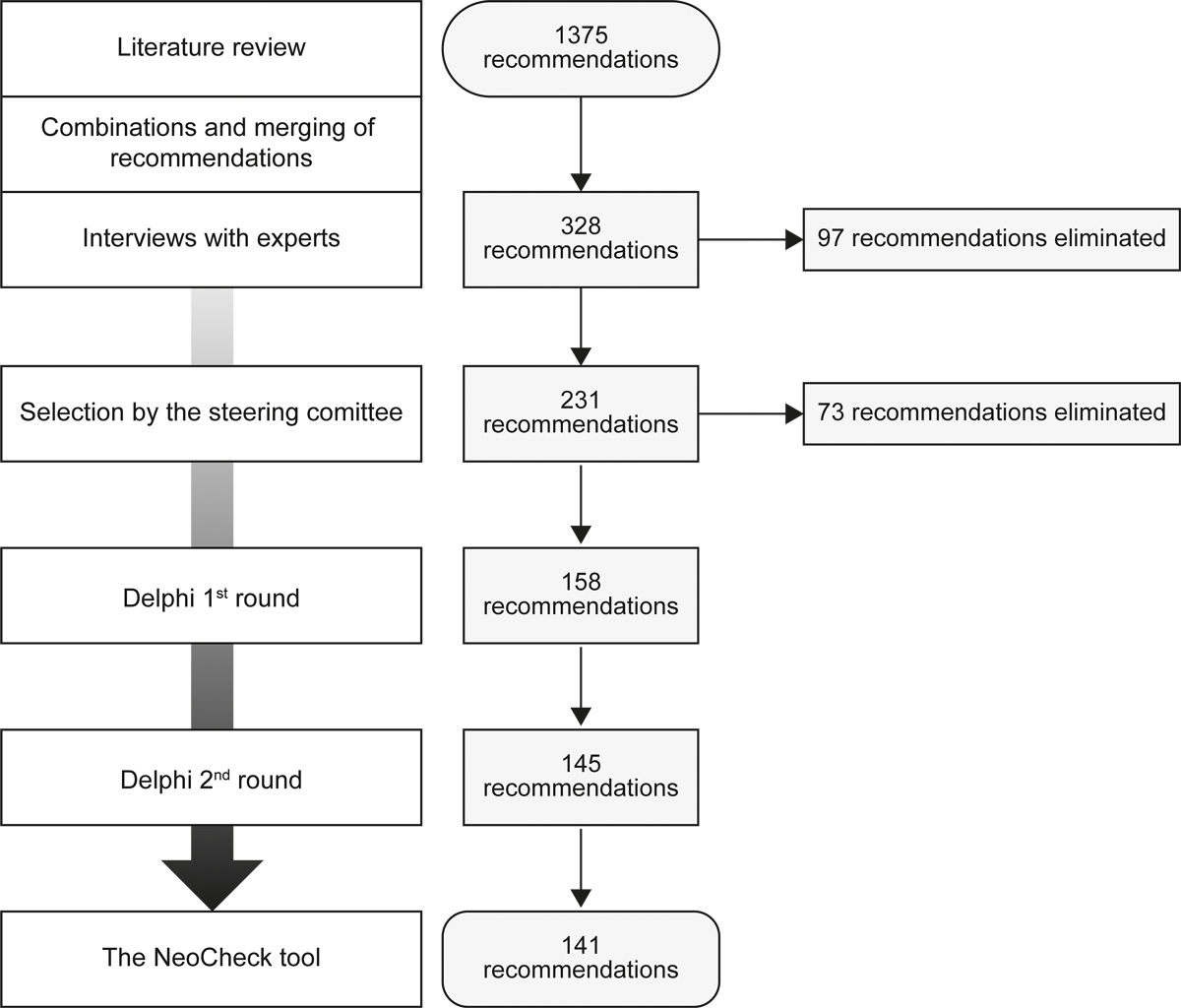 We would like to thank Peter Rimensberger, who accepted the involvement of his medical team in this project. We thank the paediatricians at the Geneva University Hospitals who took part in interviews during recommendation selection: Klara Posfay-Barbe, Paloma Parvex and Alexandra Wilhelm-Bals. We thank Majed Al-Sweidi for English correction of the NeoCheck items, and Write Science Right for manuscript editing. Finally, we thank the experts who participated in Delphi validation: RP (Geneva University Hospitals), Barthélémy Tosello (Geneva University Hospitals), Sébastien Fau (Geneva University Hospitals), Francisca Barcos-Munoz (Geneva University Hospitals), Marie Saint-Faust (Geneva University Hospitals), Jane McDougall (Inselspital Bern), Micheal Kleber (Kantonsspital Winterthur), Thomas Berger (Kantonsspital Luzern), David Palmero (Lausanne University Hospital), Olivier Baud (Geneva University Hospitals), Katrin Held-Egli (Kantonsspital Aarau), Gabriel Konetzny (Kantonsspital Aarau), Antonio Leone (Kantonsspital Winterthur), Andreas Malzacher (Ostschweizer Kinderspital), Corinne Daester (Kantonsspital Aarau), Rodgo Bjarte (Ostschweizer Kinderspital), Gihane El-Gowhari (Hôpital de la Tour), Philipp Meyer (Kantonsspital Aarau), Vincent Muelethaler (Lausanne University Hospital), Hans Ulrich Bucher (Zurich University Hospital), Thomas Riedel (Kantonsspital Graubünden) and Matteo Fontana (Kantonsspital Luzern).