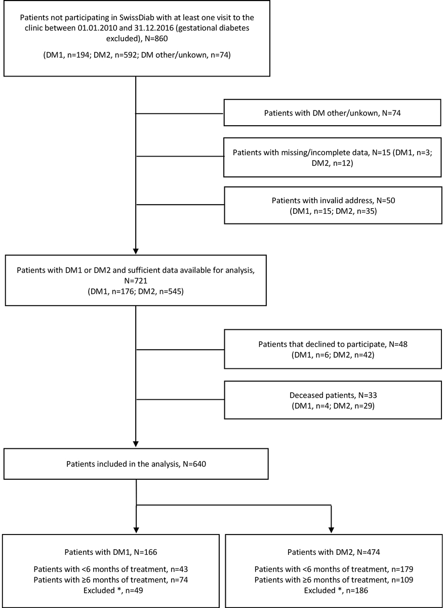 Figure 1 Flowchart showing the exclusions applied when identifying patients with DM1 or DM2 who were not participating in SwissDiab and were eligible for the current analysis. See “Nonparticipating patients” for more details on the exclusion criteria applied. DM1 = diabetes mellitus type 1; DM2 = diabetes mellitus type 2. * Patients previously excluded from participation in SwissDiab based on inclusion/exclusion criteria.