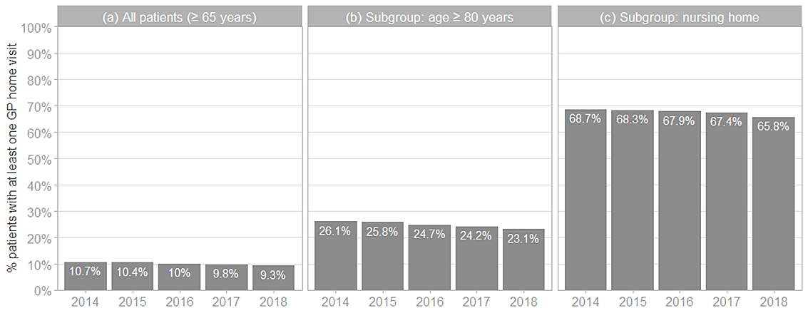 Figure 1 The proportion (%) of patients with at least one GP home visit relative to the total number of patients per year. (a) Overall patients (aged ≥65 years). (b) Subgroup including only patients aged ≥80 years. (c) Subgroup including only patients with a stay at a nursing home in the same year. A significant decrease in GP home visit rates was been observed in all patient groups (p <0.001, controlled for age and sex) (table S1).