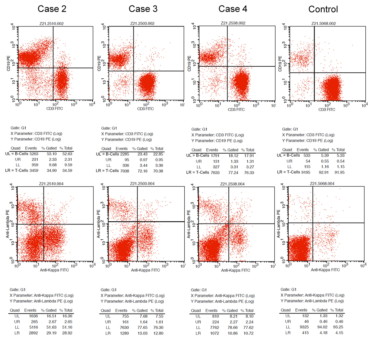 Figure S1 Flow cytometry in Patients 2–4 compared with a control case (48-year-old, unvaccinated female with nonspecific lymphadenopathy).
