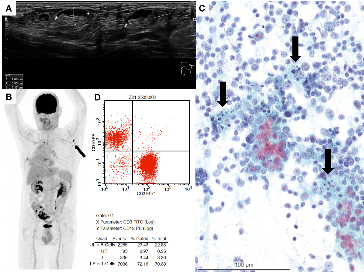 Figure 1 A: Sonography of the axilla in Patient 1 revealed an enlarged lymph node. B: Corresponding PET-CT scan in Patient 1 shows axillar lymph nodes ipsilateral to vaccination site with high FDG activity. D: Flow cytometry in Patient 3 showing a T-cell predominant population with 72% CD3-positive T cells over 23% CD19-positive B cells. C: Smear of fine needle aspiration (FNA) (Papanicolaou staining) showing a mixed lymphoid population with lymphocytes at different stages of maturation and numerous tingible body macrophages (arrows).