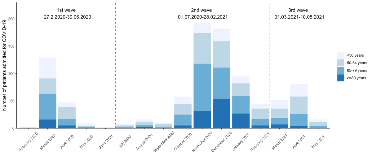 We conducted a single-centre retrospective cohort study at the University Hospital Basel, a tertiary care centre in Switzerland with 773 beds and 37,000 annual hospital admissions. All patients with SARS-CoV-2 infection confirmed by reverse transcription polymerase chain reaction (RT-PCR) test hospitalised at the University Hospital Basel from 27 February 2020 to 10 May 2021 were included in the study. Only patients with a hospitalisation for COVID-19 or a hospitalisation complicated by a SARS-CoV-2 infection were included. Recurrent admissions of the same patient were considered as additional hospitalisations if the patient persistently tested positive for SARS-CoV-2. Patients were excluded if general informed consent was declined. Reflecting the dynamics of the epidemic in our region, we stratified the data in three periods: First, second and third waves from 27 February to 30 June 2020, 01 July 2020 to 28 February 2021 and 01 March to 10 May 2021, respectively. The electronic patient information system was screened daily by the study team for new patients admitted with positive SARS-CoV-2 RT-PCR. The data were collected and entered in a study database by trained physicians of the study team. There was no further data validation process. The study has been approved by the Ethikkommission Nordwest- und Zentralschweiz, Switzerland (Project-ID 2020-00769) and registered at ClinicalTrials.gov (NCT04351503). The study adheres to the Declaration of Helsinki.