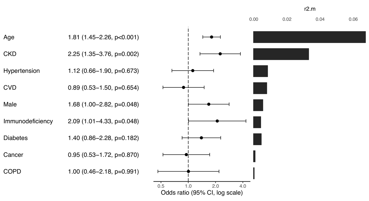 Figure 3 Odds ratio plot displaying the adjusted odds ratio (OR) with the 95% confidence interval (CI) of each variable to predict in-hospital mortality over all three waves. On the right side the average contribution of each variable is plotted on a horizontal scale representing the average contribution of each variable to the model using McFadden R. A table with all the crude and fully adjusted effect estimates, 95% CI and p-values is presented in the appendix. CKD = chronic kidney disease; CVD = cardiovascular disease