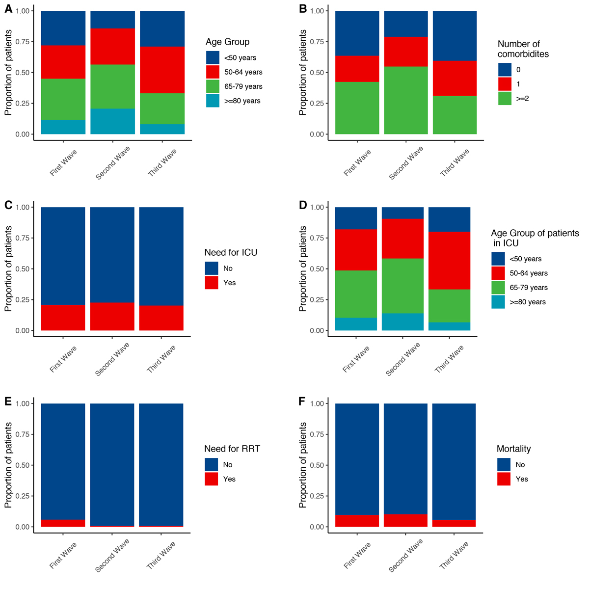 Figure 2 Proportion of patients during the three waves stratified by age (A), number of comorbidities (B), need for ICU (C), age at ICU (D) need for renal replacement therapy during hospital stay (E) and mortality (F). ICU = intensive care unit; RRT = renal replacement therapy.