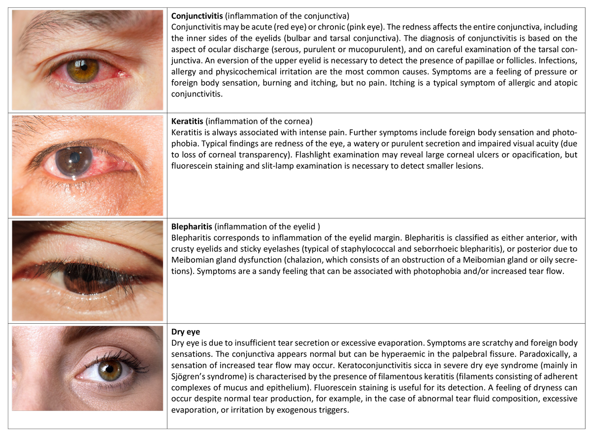 Red flags for immediate ophthalmological consultation are loss of transparency in the eye, vision loss, discharge and an increase in ocular pressure [12]. Patients wearing contact lenses presenting with red eyes should immediately be referred since they are at high risk of having an infectious keratitis.