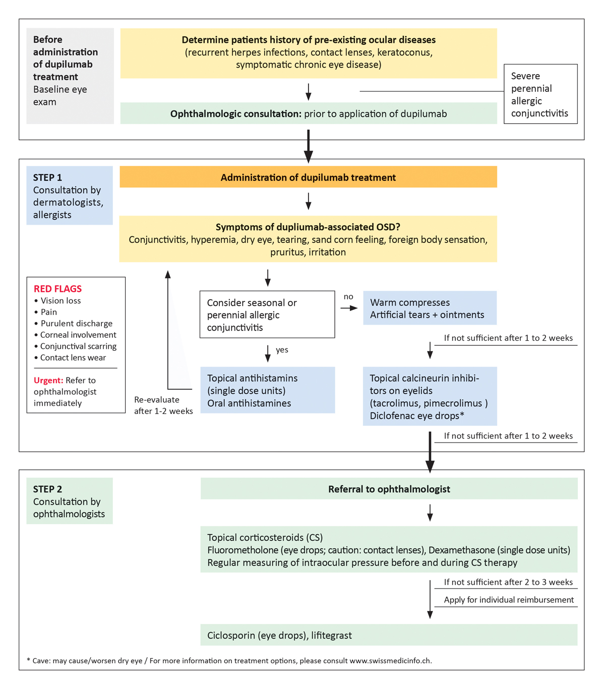 A Swiss expert group of dermatologists and ophthalmologists with experience in the treatment of ocular surface diseases (OSDs) in patients with atopic dermatitis from university and cantonal hospitals reviewed data in clinical trials and real-life reports on dupilumab therapy, published case reports on the management of OSD, as well as recent national and international recommendations. Based on the observations of dupilumab-associated OSD and practical experience in identifying and treating OSDs, an algorithm has been developed that is specific to the needs in Switzerland. The level of agreement in the development of the algorithm was determined with the consent of seven of the nine experts.
