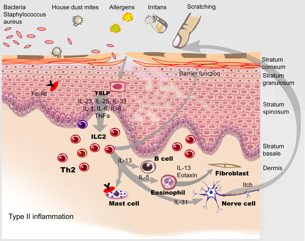 Figure 2 The targets of dupilumab in atopic dermatitis skin characterised by a type 2 immune reaction. Illustration: Aldona von Guten (modified from: Simon D, Wollenberg A, Renz H, Simon HU. Atopic Dermatitis: Collegium Internationale Allergologicum (CIA) Update 2019. Int Arch Allergy Immunol. 2019;178(3):207–18 [1], reprinted with permission from S. Karger AG, Basel).