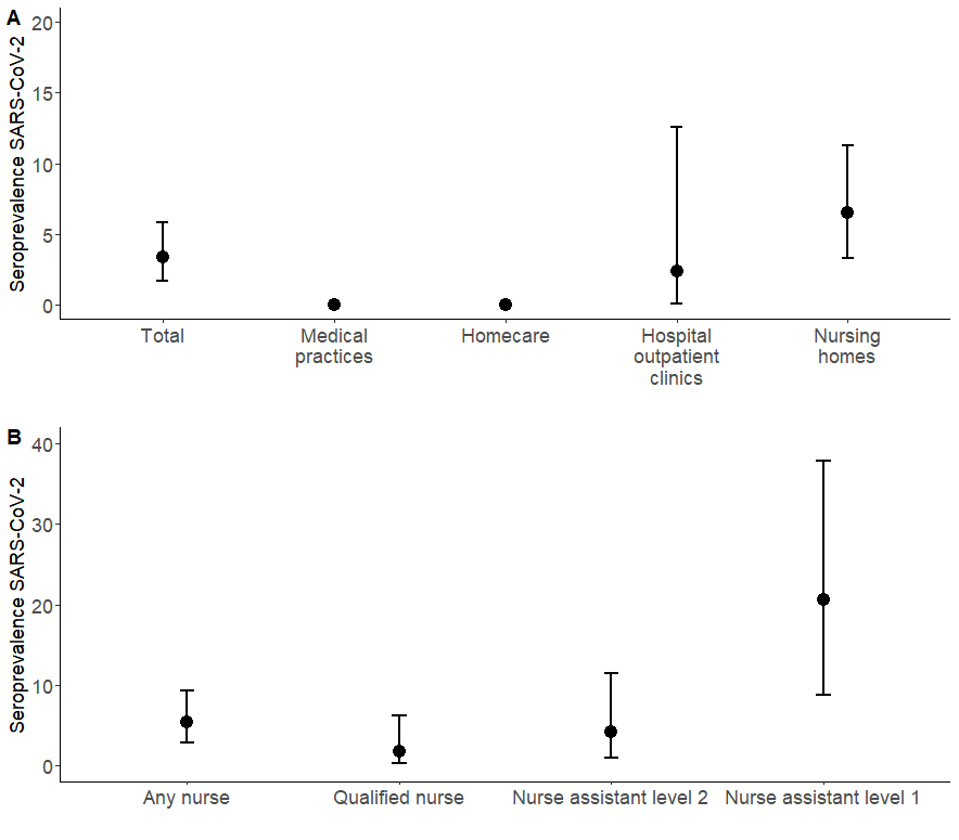 Figure 1 eSARS-coV-2 seroprevalence by (A) workplace and (B) among nurses (homecare, outpatient departments of the hospital, nursing homes). There were no events in the categories “medical practices” and “homecare”.
