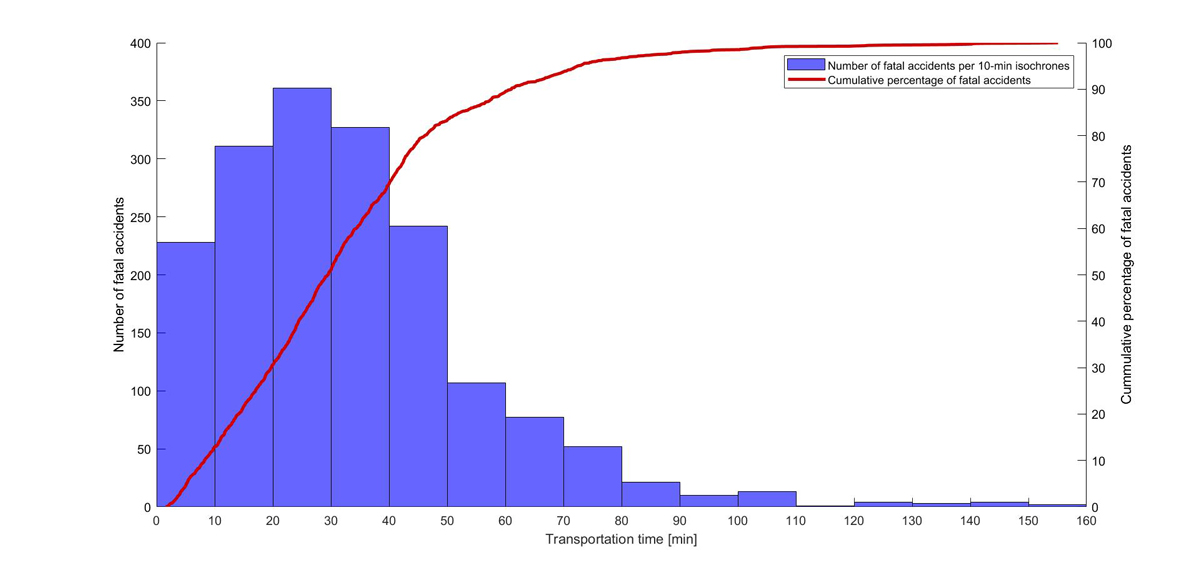 The number and cumulative proportion of fatal accidents per 10-minute isochrone is depicted in figure 2; 45.0% of fatal accidents took less than 27 minutes of transport and 85.8% took less than 54 minutes of transport.