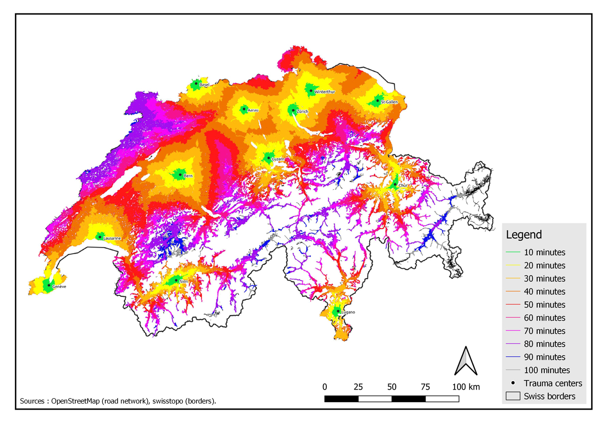 Road accidents were the seventh leading cause of disability-adjusted life-years in 2019 worldwide, and the leading cause in the age group 10 to 24 years [1]. In 2019 in Switzerland, 17,761 road accidents that caused injuries occurred, including 17,641 minor injuries, 3,639 serious injuries and 187 fatalities [2]. Prompt access to a trauma centre can reduce mortality and trauma-related sequelae for those seriously injured in a road accident [3, 4]. This time dependence has been conceptualised as the Golden Hour, which links access time to definitive treatment in a trauma centre within 1 hour of trauma to reduced risk of morbidity and mortality [5]. The Golden Hour spans the time from the call to the emergency dispatch centre to arrival at the nearest trauma centre.