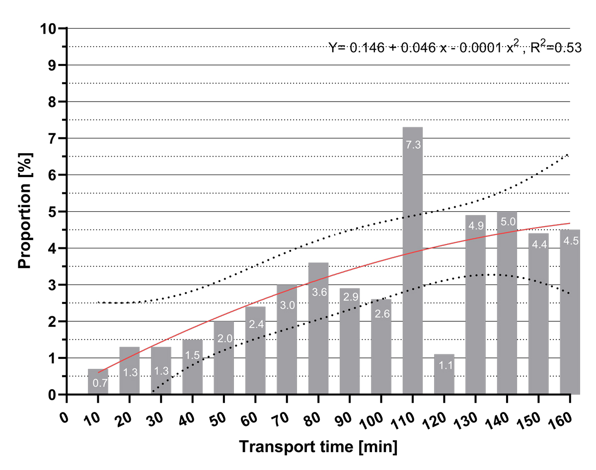 The average proportion of fatal accidents to the total number of serious accidents was 2.8%, and this increased with longer transport times to the trauma centre (fig. 3). Indeed, there was an association between mortality and transport time, which was notably linear up to 80 minutes, with an average increase in mortality of 0.4% per 10-minute isochrone.