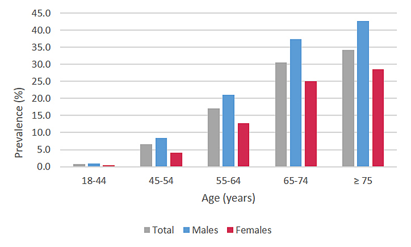 Figure 1 Prevalence of patients with ≥ 1 filled prescription of any lipid-lowering drug in the year 2019 (n= 841682), by age and sex, extrapolated to the Swiss population level.