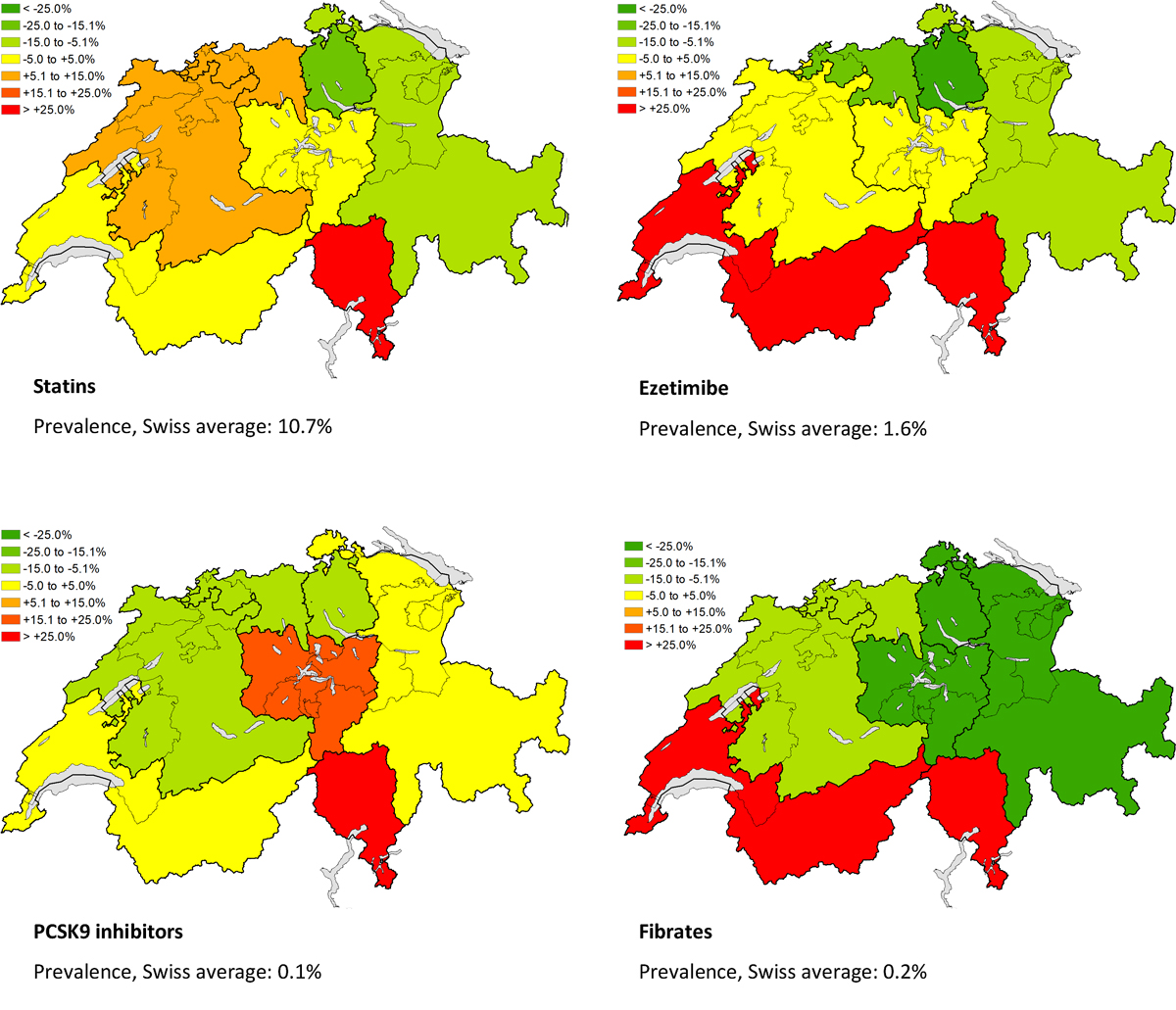 Relative to the Swiss average, we found a higher prevalence of use of most lipid-lowering drug classes in the Italian-speaking and French-speaking parts of Switzerland (Ticino and Lake Geneva region), and a lower prevalence in the Zurich region and Eastern Switzerland. This is in line with findings from the Swiss Health Survey 2007, which reported higher and lower dyslipidaemia screening and treatment rates in the mentioned regions, respectively. The regional differences cannot be accounted for by differences in population characteristics such as sex, age and educational level, but may partly be due to differing local habits and health policies [24].