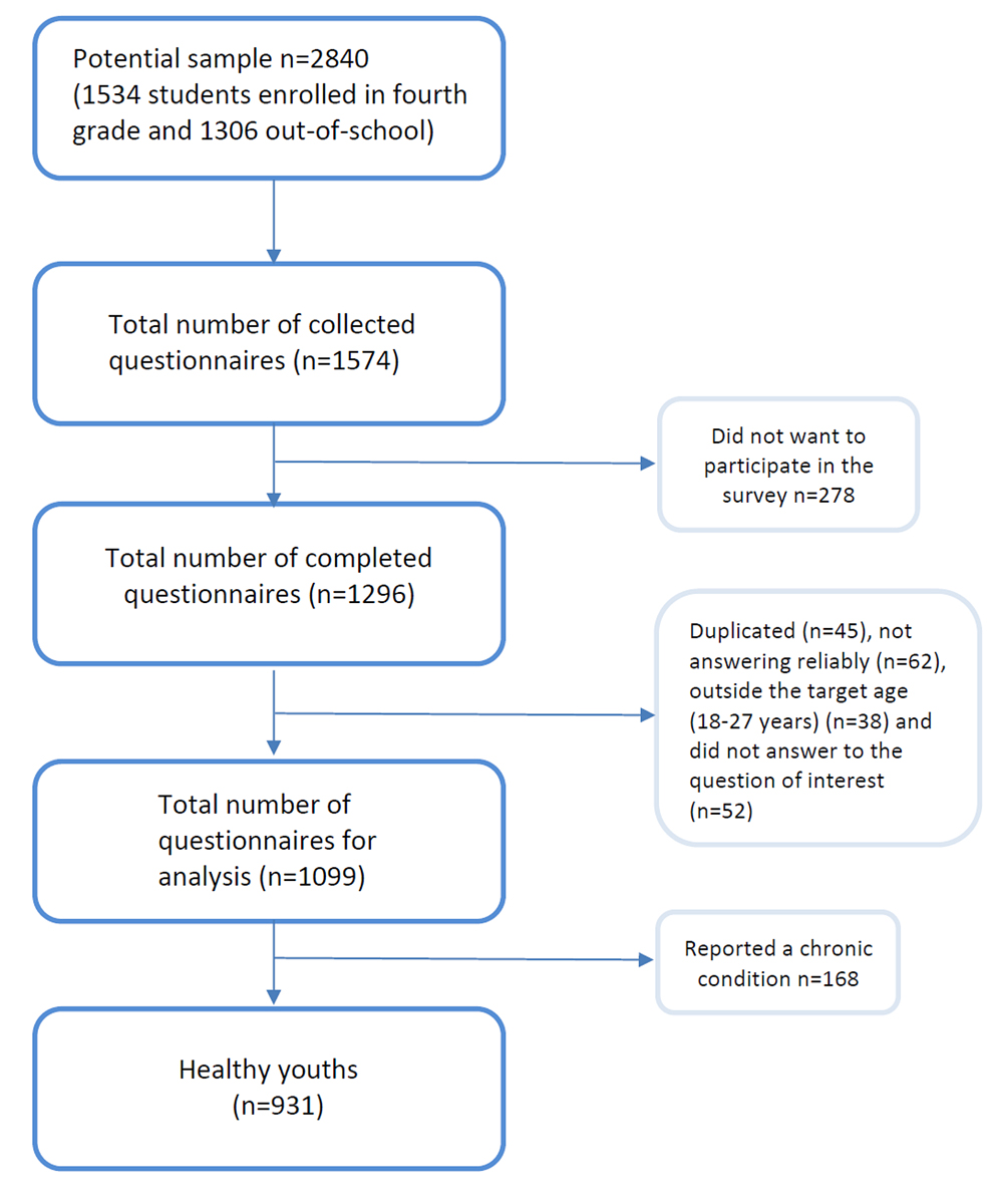 We used the fourth wave (2018–2019) of the GenerationFRee study, a web-based survey on the lifestyle of youths carried out in the 11 post-mandatory schools (five high schools and six vocational schools) of the canton of Fribourg. In Switzerland, after mandatory education (age ~15 years ), about one third of young people attend high school and two thirds vocational schools. All students in the fourth year of post-mandatory education (high school or vocational school) were invited to answer an anonymous questionnaire online in the computer classroom of their school (n = 1534). However, as most vocational programmes last 2 or 3 years, we asked former students to also answer the survey using contact details collected during the previous waves (n = 1306). In addition, as some students were doing an internship during that period, we asked their teachers to send them an email with the link to the online survey so that they could participate in the study. Out of 1574 collected questionnaires (response rate: 55.4%), 1099 were considered for analysis. After eliminating those with a chronic condition, the final sample included 931 healthy youths (refer to the flowchart, fig. 1).