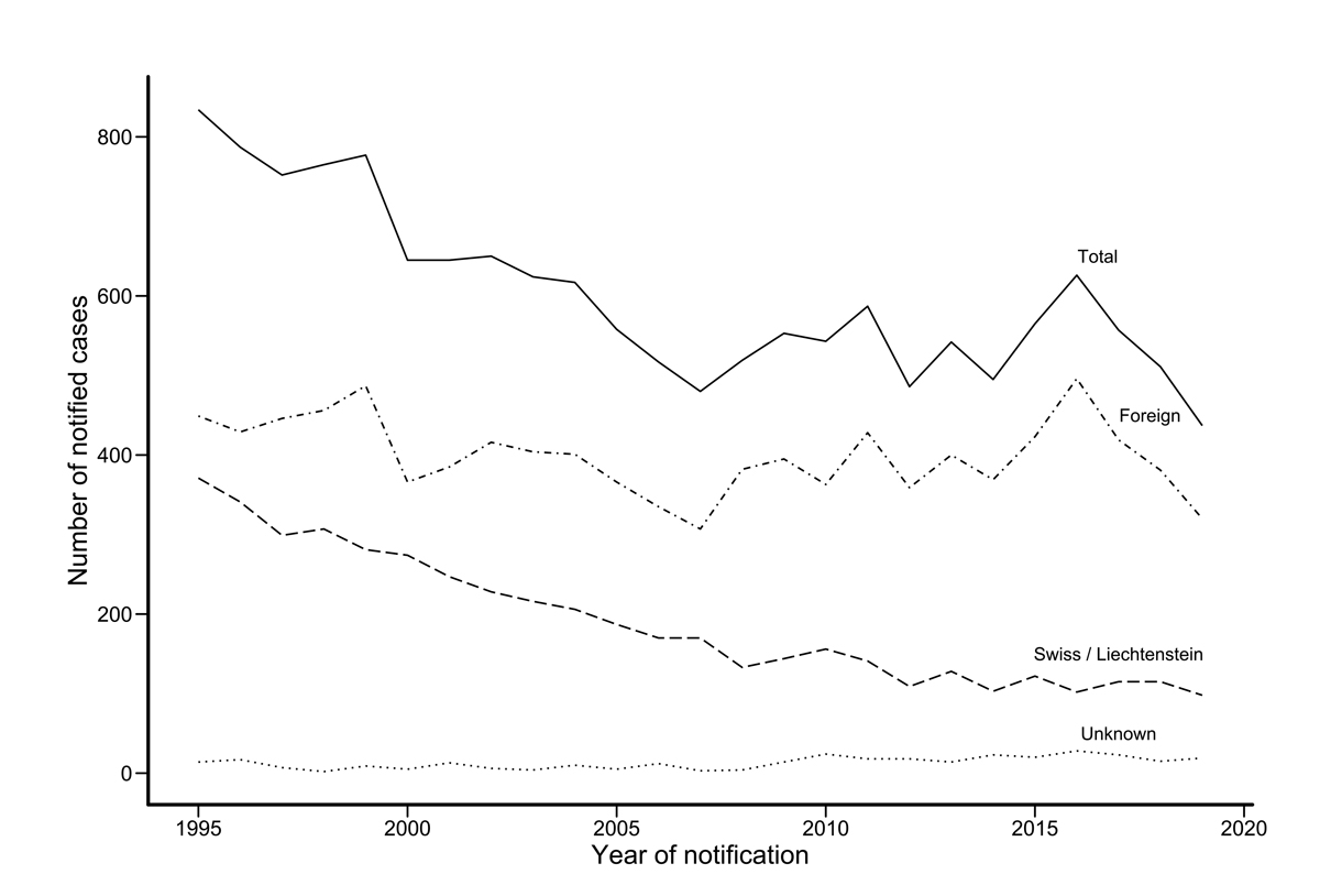 A possible limitation to our analysis is a potential bias that might be introduced by underreporting – a concern of every notification system. However, no national studies exist addressing this specific problem. The dual system mandating both physicians and laboratories to report on tuberculosis gives some assurance that at least the notification of laboratory-confirmed tuberculosis is likely to be a good proxy for the incidence of tuberculosis diagnoses. Because tuberculosis notification uses the patient’s full name, the FOPH cannot collect potentially stigmatising medical risk factors such as human immunodeficiency virus infection, alcoholism, or diabetes.