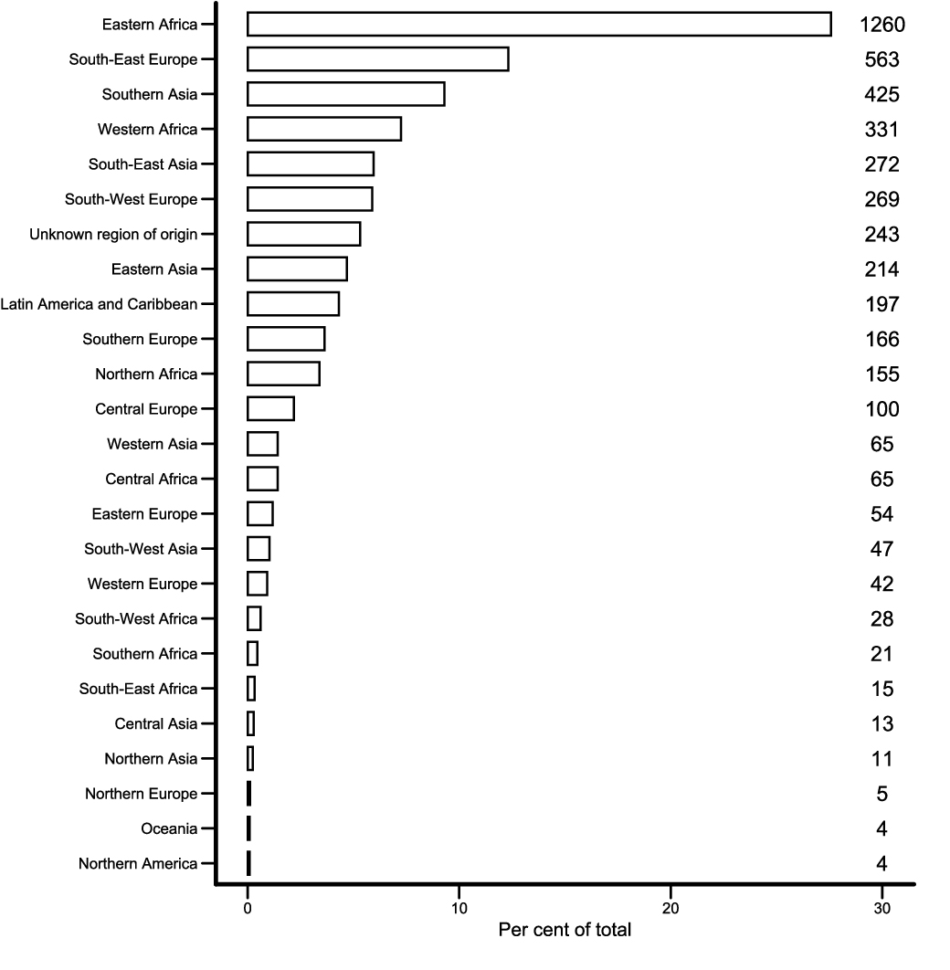 The large majority (73.8%) of tuberculosis cases in Switzerland was acquired abroad, in immigrants from countries with a high incidence of tuberculosis. Most foreign tuberculosis patients immigrated from Eastern Africa (28%), South-East Europe (12%) and Southern Asia (9%) (fig. 2). When cases with missing information were excluded, patients from these three world regions made up 52% of all with foreign origin. The eight most affected countries were Eritrea (n = 685), Somalia (n = 420), Portugal (n = 232), Kosovo (n = 179), Tibet (China) (n = 156), India (n = 140), Sri Lanka (n = 128) and Ethiopia (n = 110). These eight contribute 47.4% of notifications among those of foreign origin with known provenance.