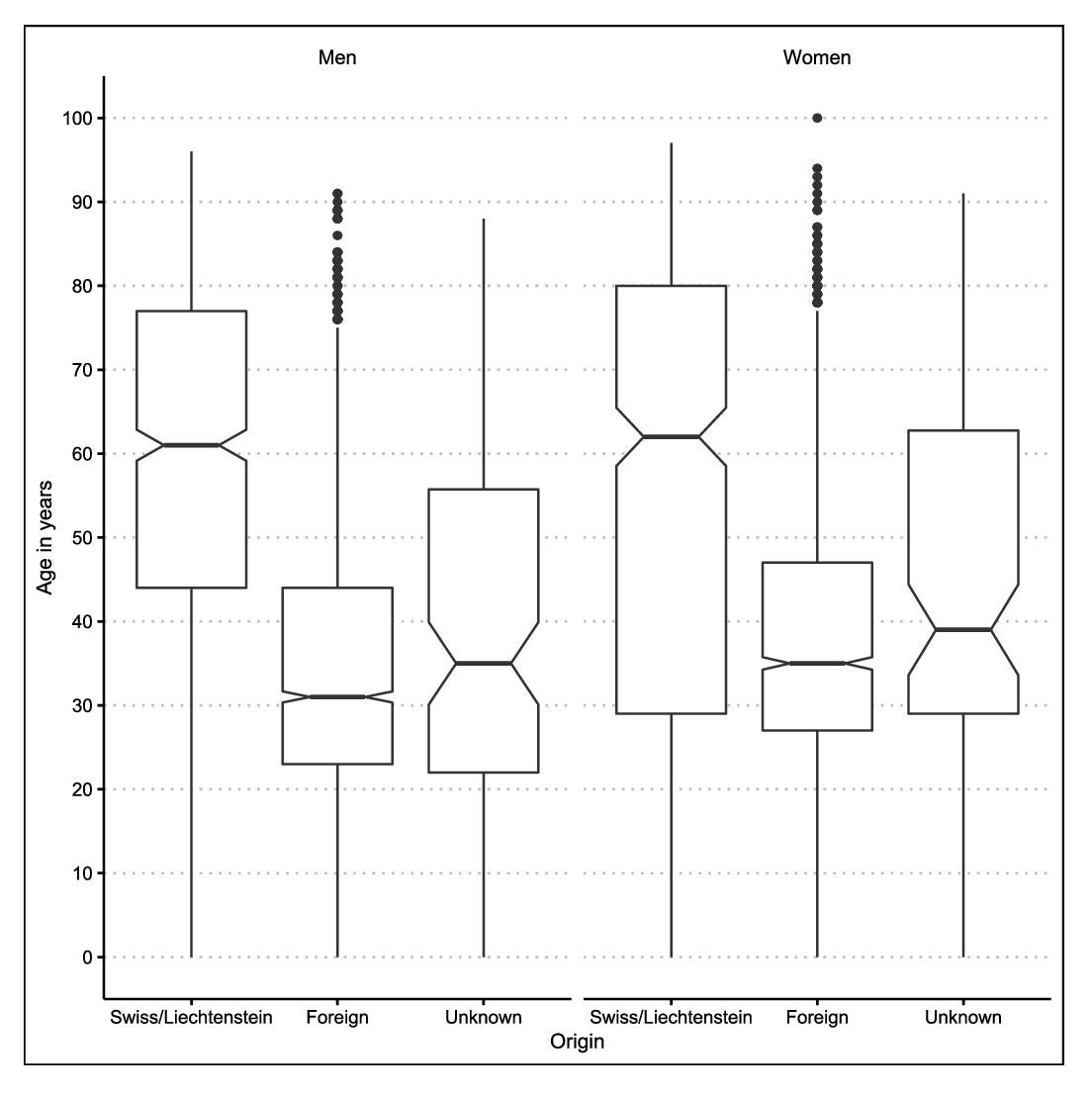 Origin refers to the country of birth if known. If country of birth is unknown, nationality is used instead. If both are missing, origin is missing as well. This results in the following categories: Swiss (including the Principality of Liechtenstein), foreign and unknown origin. The FOPH defines world regions according to the Swiss Federal Statistical Office [6].