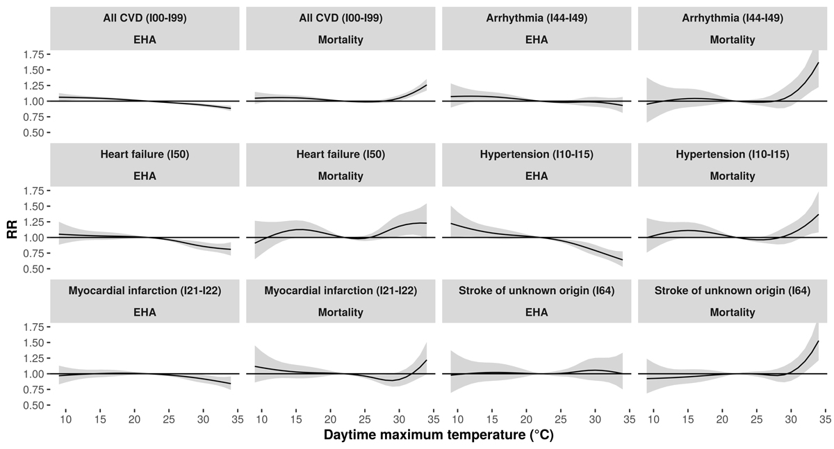 Figure 1 Relative risks (RRs) for emergency hospital admissions (EHA) and mortality for cardiovascular (CVD) disease groups with more than 10,000 cases by daytime maximum temperature. RRs are cumulative over the lag period of 10 days. Median daytime maximum temperature over the study period is used as reference.