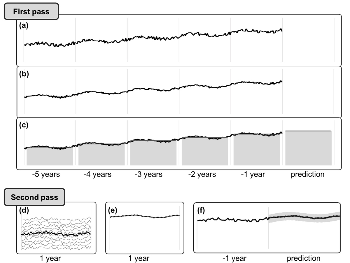 Overall, the procedure consists of two consecutive passes, the first pass estimating the overall mortality level of the present year for which predictions are generated, the second pass estimating calendar-weekly numbers of deaths. Splitting the estimation into two passes allows secular mortality trends (including demographic changes, population growth and increasing life expectancy) to be accounted for in the first pass and seasonality in the second.