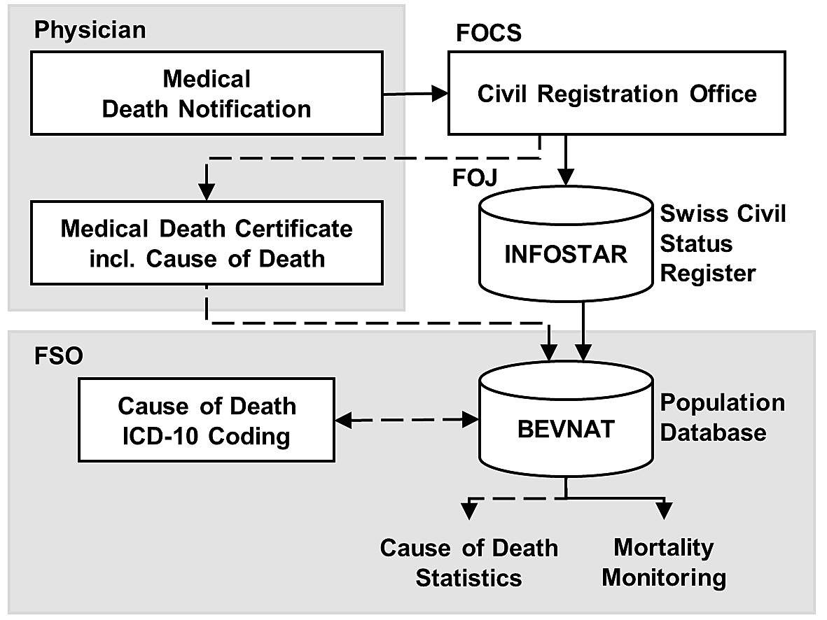 When a person dies in Switzerland, the competent civil registration office is notified, usually by the attending physician, by the hospital or nursing home management, or by relatives of the deceased. Every business day, the FSO receives notifications on recent cases of death, including date of death, location and age of the deceased. As of 2005, this is by the civil registration offices (coordinated by the Federal Office of Civil Status, FOCS) updating a deceased person's civil registration record in the national Infostar database. This first part of the collection of mortality data is thus centred on registering and processing events and the corresponding personal data. It is the basis of the weekly updates through the FSO's mortality monitoring. The focus of the present paper is on this fast part of the mortality data collection and reporting. However, before the details of this process are addressed, a brief overview will be given of the second, more time-consuming part, which leads to the cause of death statistics.