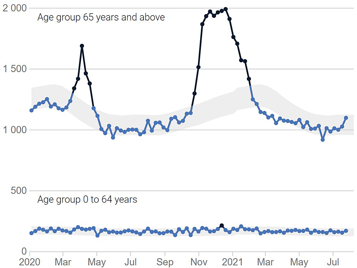 Figure 2 Federal Statistical Office web publication on the weekly number of deaths in Switzerland by age group (with completed years of life), from week 1, 2020 to week 29, 2021. The connected dots represent numbers of observed deaths per week; the bands are two-sided 99% confidence intervals around the predicted numbers for the corresponding weeks (data status 03 August 2021) [5].