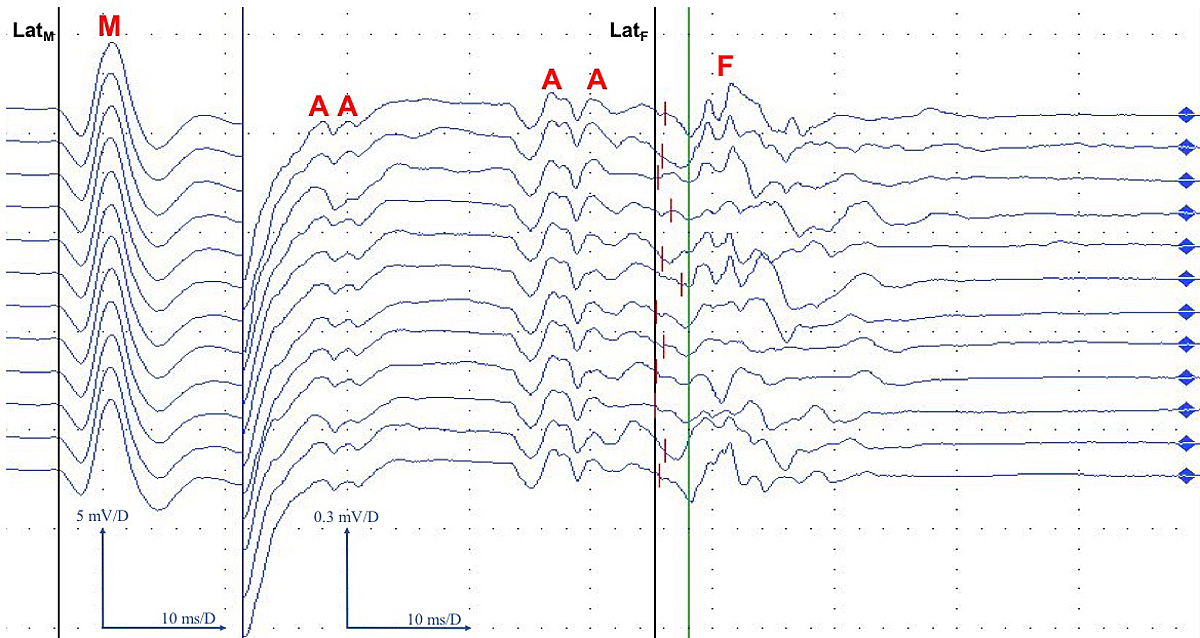 Black vertical line LatM: M response latency; M: (direct) motor response; A: A waves; black vertical line LatF: best F wave latency (55.3 ms); green vertical line: F wave latency cutoff (58 ms); F: F waves.