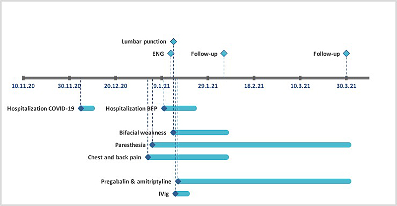 These findings were in line with a demyelinating process. Diagnosis of GBS subtype BFP was made. Paralysis of the extremities or respiratory muscles was not present at any time. An anti-inflammatory medication with intravenous immunoglobulins at a dose of 0.4g/kg for 5 days and analgesic treatment with pregabalin and amitriptyline was initiated. The patient’s condition improved promptly. At 1-month follow-up, only minor paraesthesia of hands and feet persisted, while bifacial weakness as well as chest and back pain had completely resolved. A follow-up ENG did not show significant differences. A visual representation of events can be found in figure 3.