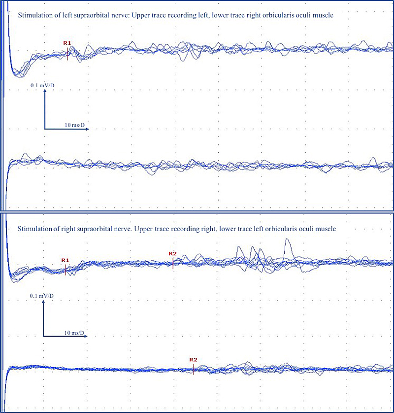 Figure 2 Asymmetric, bilateral pathological blink reflex suggestive of peripheral demyelination and partial interruption of the polysynaptic trigeminal-facial reflex.