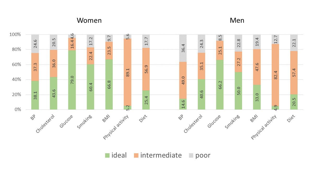 Figure 1 Prevalence of the three levels (ideal, intermediate and poor) for all seven health metrics of the American Heart Association separate for women and men.