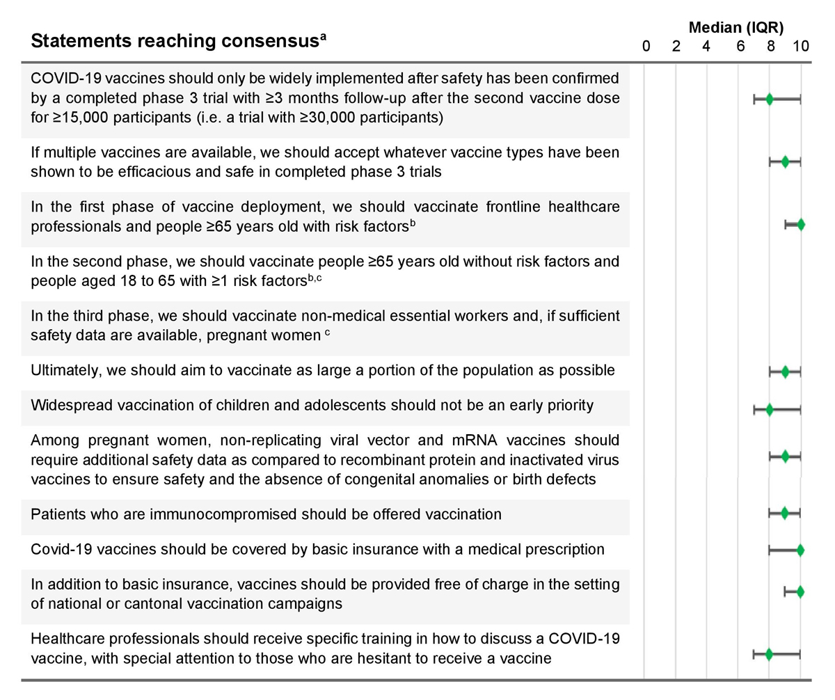 The Delphi method provides a transparent method for identifying areas of expert consensus in an environment of rapidly evolving evidence or on topics lacking evidence [9]. The Delphi method could be preferable to convening a task-force, for instance, because a large number of diverse experts can be convened asynchronously, with a written trace of all opinions and anonymous voting, allowing experts to express themselves more freely. We aimed to assist public health decision makers by identifying areas of consensus among Swiss experts for the deployment of one or more novel COVID-19 vaccines.