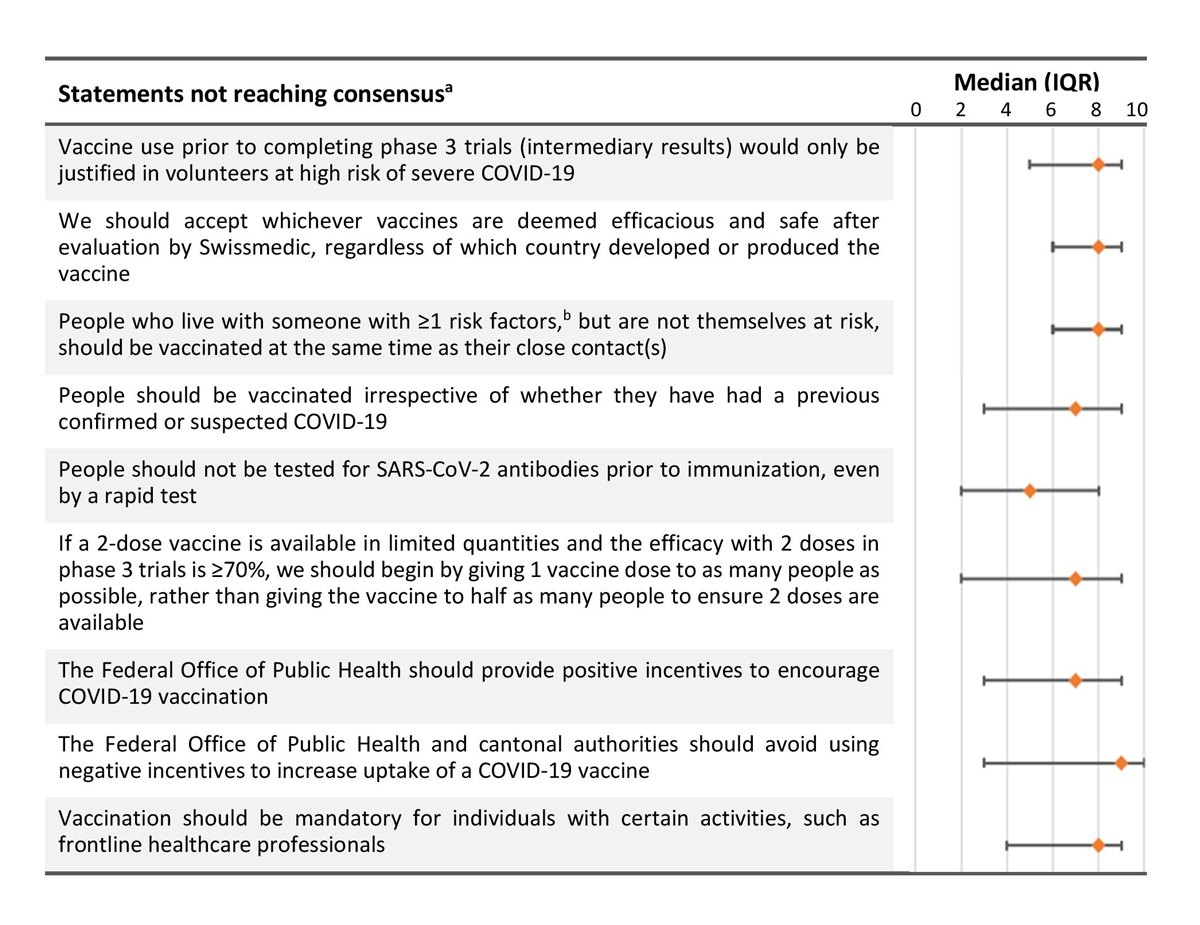 Very large IQRs of certain statements, such as for the questions whether to use incentives or make vaccination mandatory (fig. 2), might be explained in different ways: some participants might not have been familiar with evidence in these areas; the scores might reflect differences in individual values, such as the tension between personal liberty and collective security; or there could be cultural differences between groups, such as by age or regions of Switzerland. All responses were fully anonymous, so we could not analyse potential differences between groups of experts.