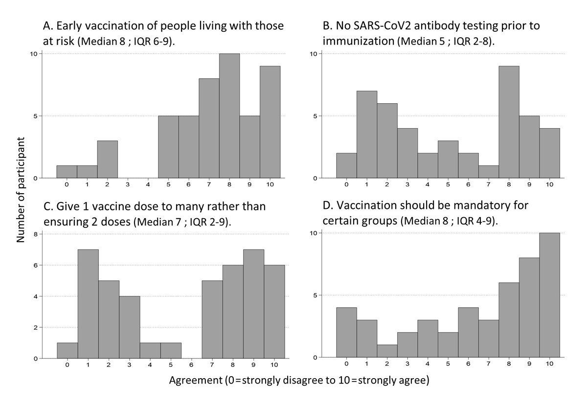 Strengths of our study included anonymous voting (without influence or judgement by others), rigorous criteria for consensus, and a diverse panel of experts. Weaknesses included convenience sampling, possibly having experts vote on questions outside their fields of expertise and limited generalisability to other countries and future decisions. A majority of our experts worked in healthcare and were of high socioeconomic status; they may have been more likely to vote for early vaccination of medical personnel than other groups. Some issues that occupied an important portion of our questionnaires, such as the minimum vaccine efficacy that would justify deployment, became quasi obsolete within a few weeks after obtaining our results. Further, we were unable to address issues that subsequently emerged, such as whether to mix different vaccines based on availability, or the use of vaccination certificates [17].