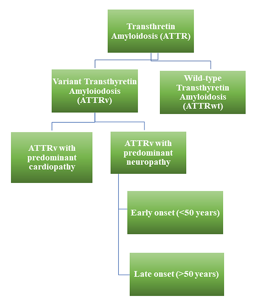 Figure 1 Schematic representation of different types of transthyretin amyloidosis. ATTR: transthyretin amyloidosis; ATTRv: variant transthyretin amyloidosis; ATTRwt: wild-type transthyretin amyloidosis.
